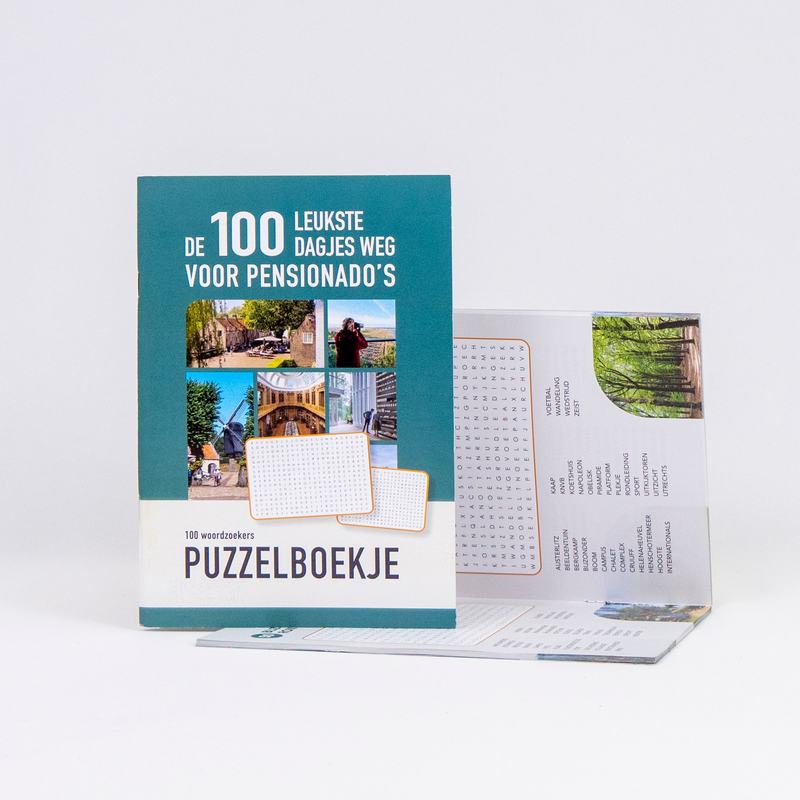 In dit pensioen cadeau pakket ontvang je bovendien een puzzelboekje dat speciaal is gemaakt bij het pensionado boek. Voor elk dagje weg is er een puzzel, leuk voor de voorbereiding of tijdens het reizen. Ook een schoudertas en een pensioen-kaart zitten in dit pakket. Dat maakt het leuk om te geven. In de tas kun je het hele pakket en eventueel nog wat extra's kwijt om het leuk te kunnen overhandigen.