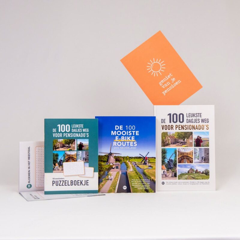 Het ultieme boek voor je pensioen. Ontdek in 100 dagjes weg de mooiste plekken, natuur, musea en hoogtepunten van Nederland. Boordevol tips, foto’s, kaarten en informatie. Eropuit in ieder seizoen. Een luxe hardcover boek met goudfolie speciaal voor (pre) pensionado’s.